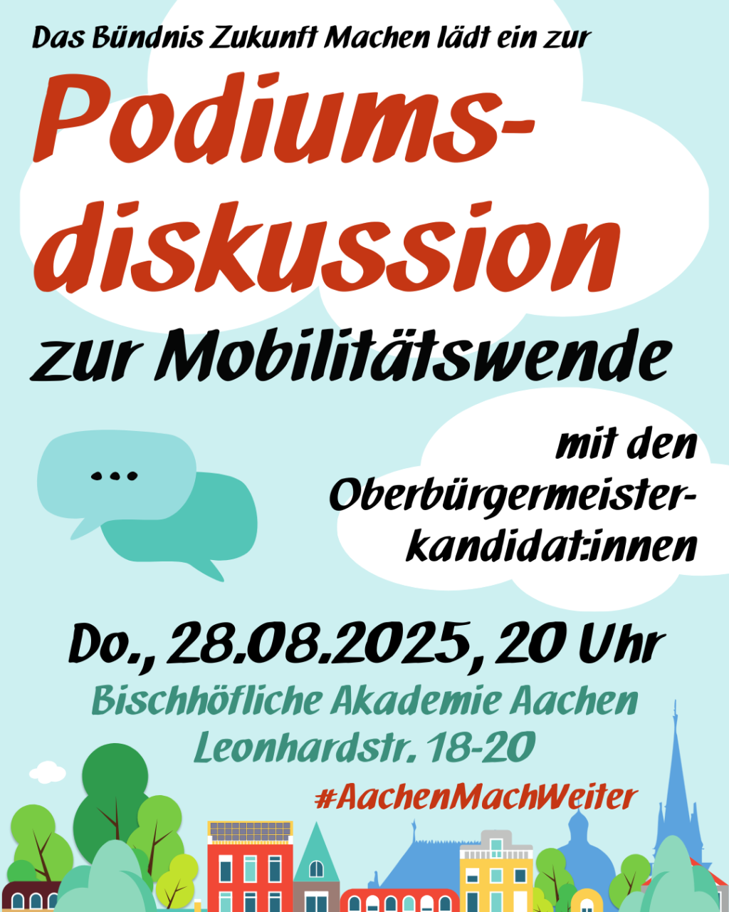 Am Donnerstag, den 28. August 2025, um 20 Uhr laden der Runde Tisch Klimanotstand und die Initiative „Aachen mach weiter!“ zu einer öffentlichen Podiumsdiskussion in die Bischöfliche Akademie (Leonhardstraße 18–20, Aachen) ein.