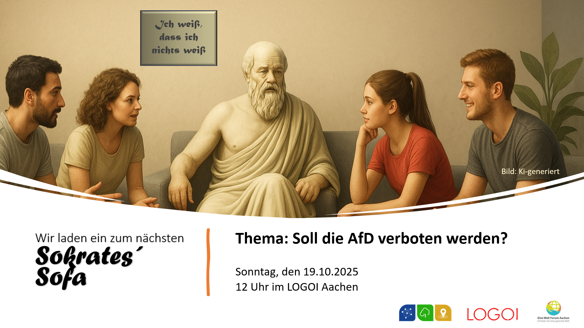 Gemeinsam mit dem Philosophischen Institut LOGOI und dem Eine Welt Forum Aachen starten wir unsere neue Veranstaltungsreihe „Sokrates’ Sofa“.