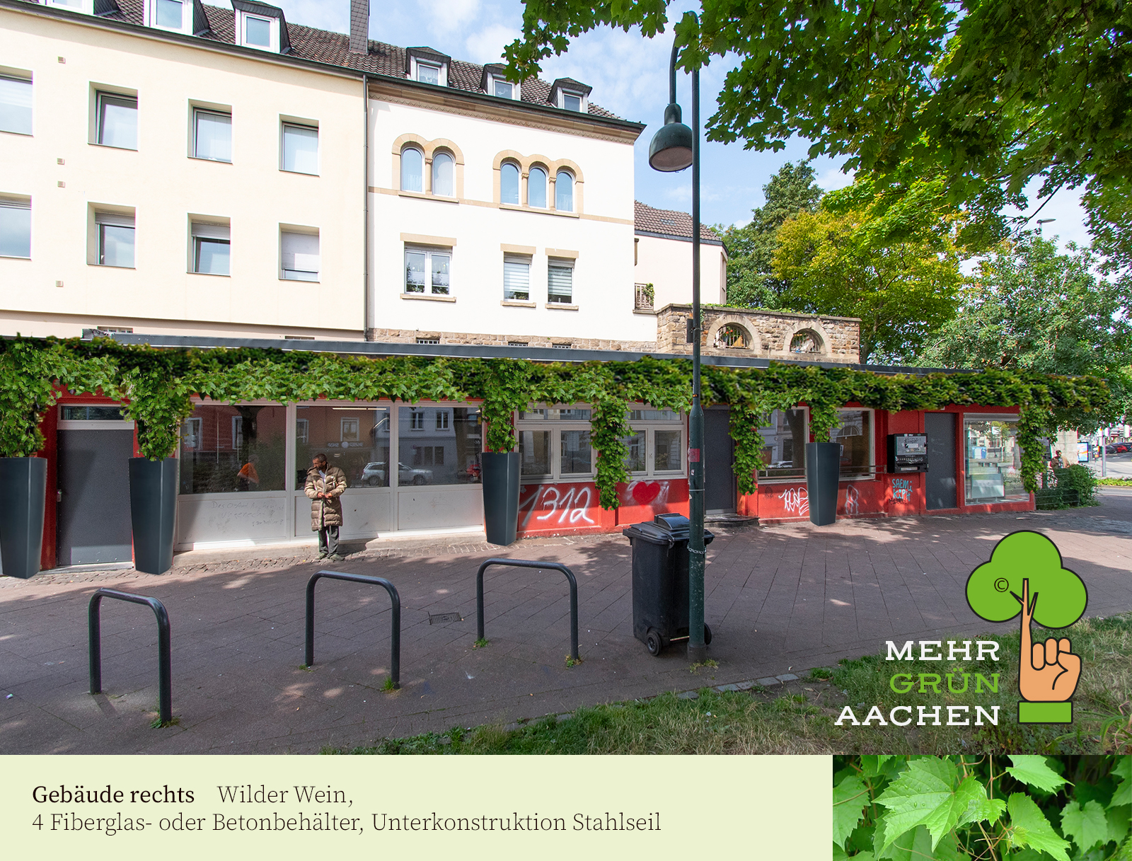 Seit 2023 stehen wir im direkten Austausch mit der Stadt Aachen, um unsere Begrünungsideen umzusetzen. Wir möchten die Stadt dabei unterstützen, Fassaden und öffentliche Plätze zu begrünen, um in den heißen Sommermonaten urbane Hitzeinseln abzukühlen und mehr Biodiversität sowie Lebensqualität in den städtischen Raum zu bringen. Unsere Vorschläge wurden seitens der Stadt durchweg positiv...