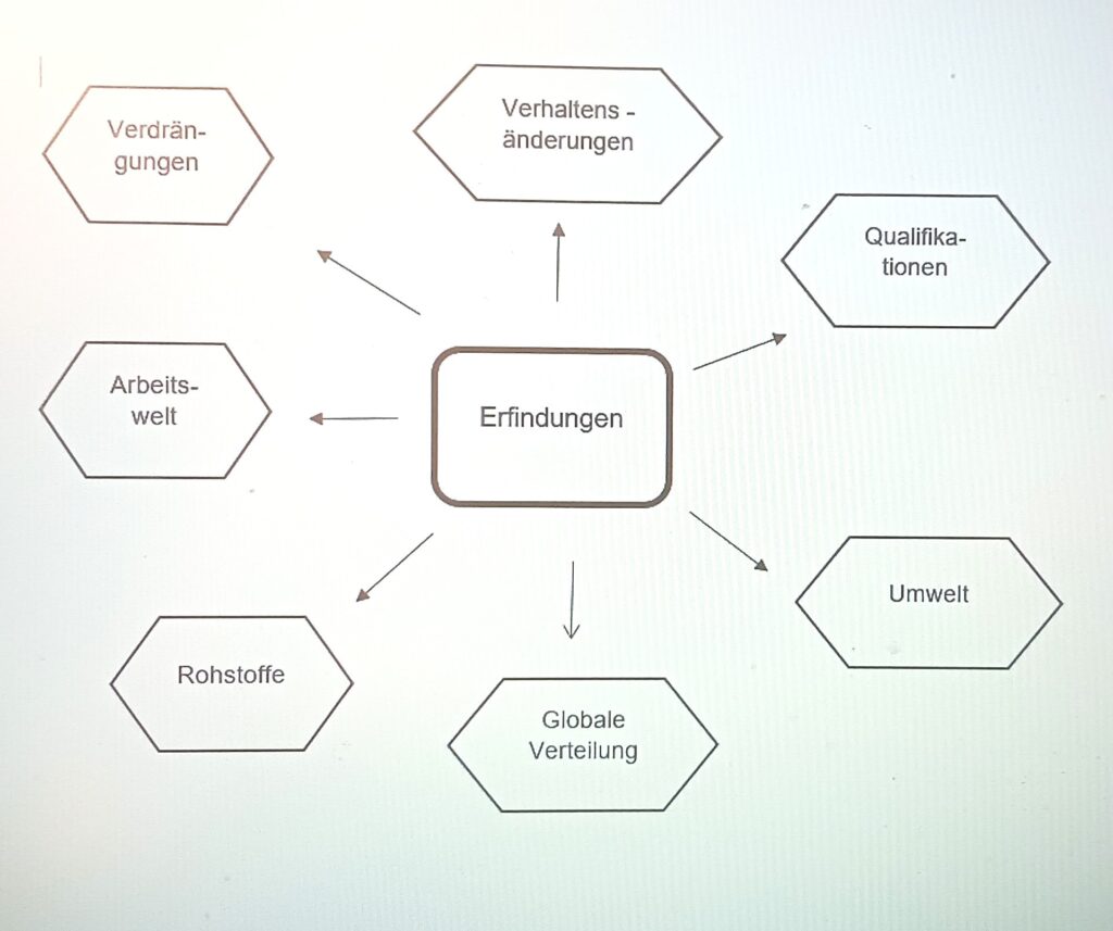 Die folgende Graphik veranschaulicht einhergehende Veränderungen von neuen technologischen Erfindungen. Eine Beachtung solcher möglichen Auswirkungen würde bei aller Unvollständigkeit und Unkenntnis aller Implikationen die Achtsamkeit erhöhen und richtige Schritte in erforderliche Maßnahmen einleiten.