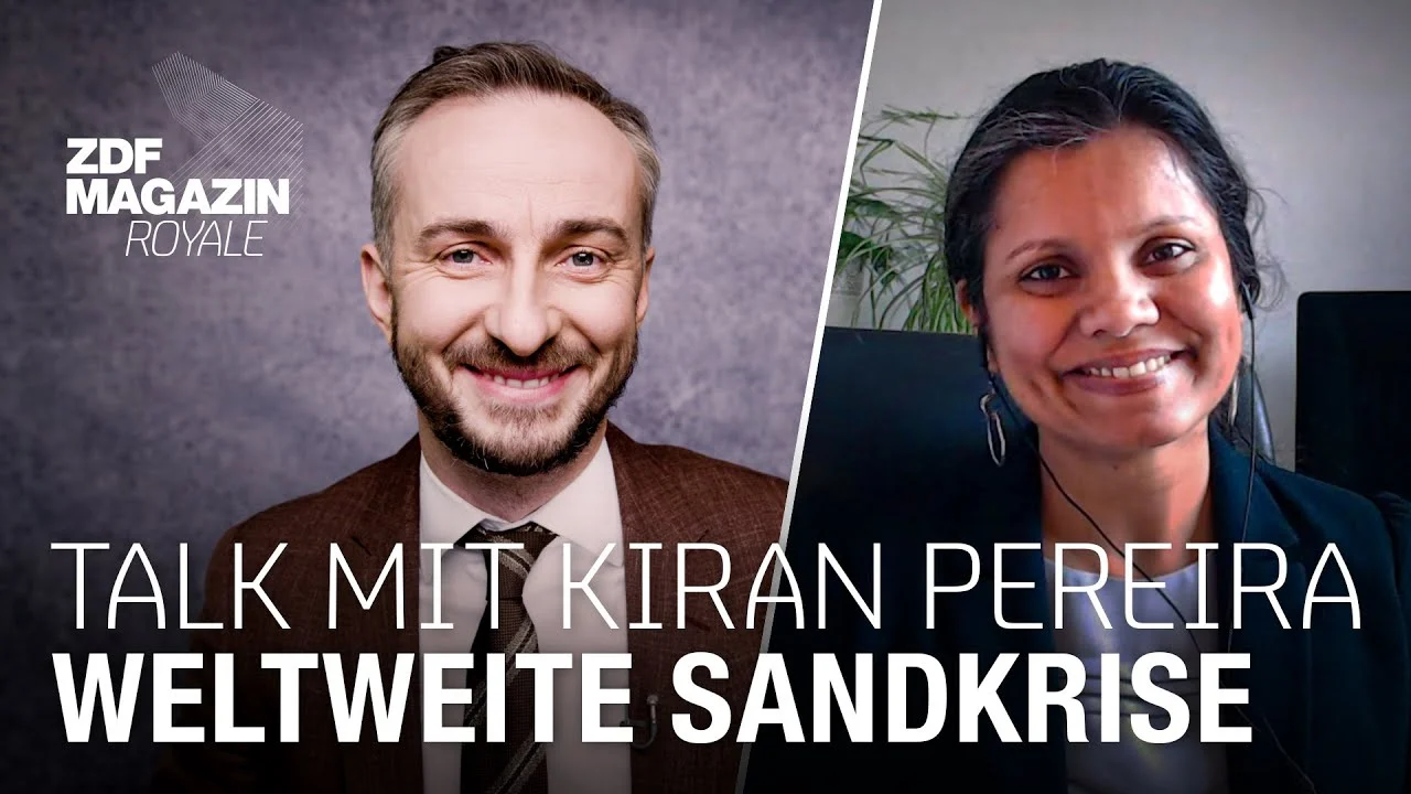 Satiriker und ZDF-Moderator Jan Böhmermann interviewt Expertin Kiran Pereira zur Sandproblematik. 15 Minuten diskutieren beide über die aufkommende Knappheit des Rohstoffs, die Gründe hierfür sowie über die ökologischen und sozialen Folgen des Sandabbaus.